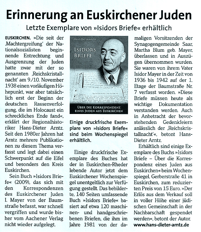 Da das o.a. Buch „ISIDORS BRIEFE“ zurzeit vergriffen, die Nachfrage aber weiterhin recht groß ist, überließ ich der Redaktion des „Euskirchener Wochenspiegels“ unentgeltlich eine überschaubare Anzahl druckfrischer Bücher aus meinem Archiv. Besonders in den nächsten Tagen – kurz vor den Gedenkfeiern zur „Reichskristallnacht“ – dürfte es Interesse an dieser unheilvollen Zeit in der Kreisstadt Euskirchen geben. Vgl. hierzu auch meine stark bebilderte Dokumentation: „REICHSKRISTALLNACHT“ – Der Novemberpogrom 1938 auf dem Lande (2008).