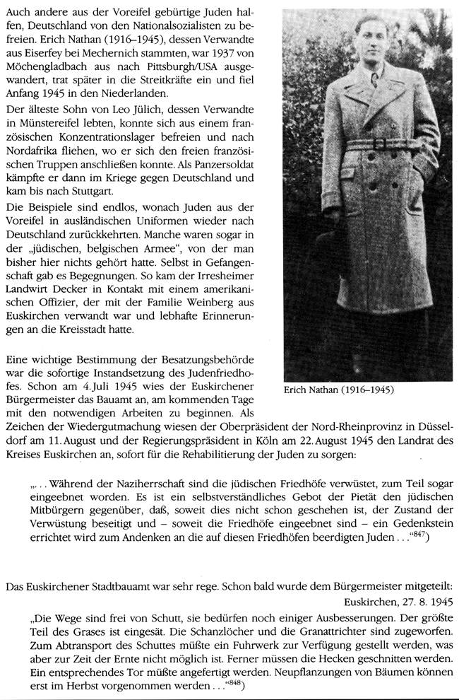 ...... Mit den Besatzungstruppen kamen auch einige Juden zurück, die im Euskirchener Kreisgebiet geboren waren. Da waren zum Beispiel Arthur Levano (1890-1960) aus Kommern, Arthur Rothschild aus Euskirchen und der aus Großbüllesheim stammende Helmut Meyer, dessen Vater Bernhard Meyer seinerzeit eine Metzgerei am Bahnhof hatte. Die Zurückkehrenden trafen beim Wiedersehen mit ehemaligen Freunden und Nachbarn eine sehr genaue Auswahl. Dennoch war ihnen alles fremd geworden. Das Aussehen der ehemaligen Heimat hatte sich geändert; viele Bekannte waren zudem im Kriege umgekommen.