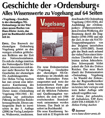 Als neue Anerkennung ist sicher auch die Entscheidung des NRW-Ministeriums für Generationen, Familie, Frauen und Integration in Düsseldorf zu werten. Nach Überprüfung des Standardwerkes durch die Landeszentrale für politische Bildung NRW teilte der Leiter des Referates für Printmedien, Prof. Dr. Andreas Kost, mit, einen Teil der 5. Auflage zu erwerben. Das Buch „Ordensburg Vogelsang 1934-1945 – Erziehung zur politischen Führung im Dritten Reich“ soll „ in fachspezifischen Kontexten der Gedenkstättenarbeit in der Landzentrale für politische Bildung NRW“ eingesetzt werden. Der Euskirchener Autor Hans-Dieter Arntz freut sich über diesen Entscheid, da für das übliche Printmedienverzeichnis die Dokumentation eigentlich etwas zu speziell ist. In der Regel präferiert die Landeszentrale allgemeinere Überblicksliteratur – so auch beim Thema Gedenkstätten. Das Standardwerk ist natürlich weiterhin im guten Buchhandel und im Besucherforum der Burg Vogelsang im Nationalpark käuflich zu erwerben.