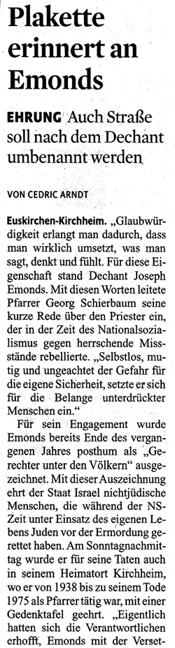 In diesem Sinne berichtete die WDR-Fernsehsendung „Lokalzeit Aachen“ am 27. Januar über den Joseph Emonds (1898-1975), der in Kirchheim/bei Euskirchen mehreren verfolgten Menschen das Leben gerettet hatte und deswegen posthum am 15. Dezember 2014 von Yad Vashem in Berlin als „Gerechter unter den Völkern“ gewürdigt wurde. Der etwa 3 Minuten dauernde Film ist zurzeit noch über die WDR-Mediathek abrufbar und lässt die beiden Neffen des katholischen Geistlichen, Hans und Josef Emonds aus Erkelenz-Terheeg, zu Wort kommen, so dass die Persönlichkeit des Onkels deutlich wurde.
