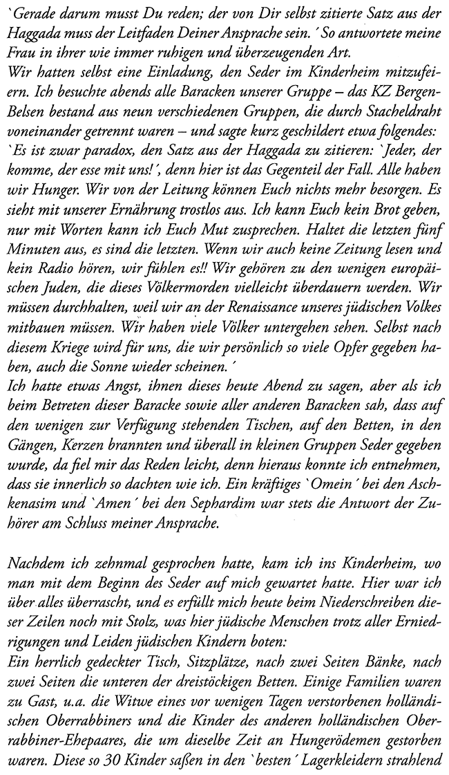 In meinem Buch über den inzwischen berühmten „letzten Judenältesten von Bergen-Belsen“ habe ich zwei Berichte über den Sederabend 1945 im Konzentrationslager Bergen-Belsen publiziert. Ich möchte sie in dem vorliegenden Artikel noch einmal im Zusammenhang vorlegen:
