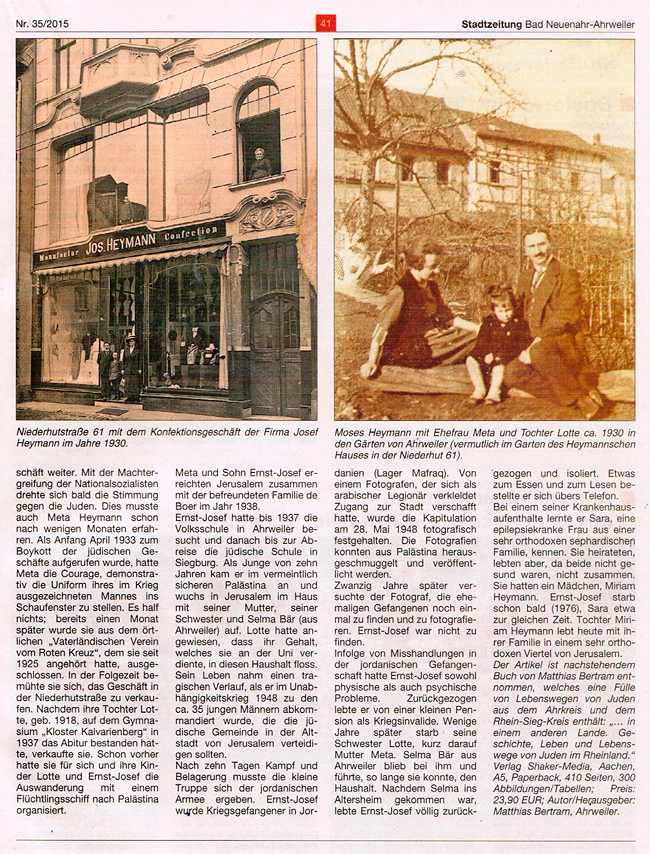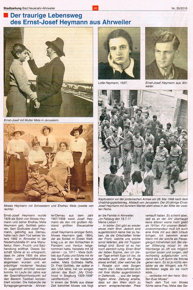 Die Geschichte der jüdischen Familie Heymann wurde in der Ausgabe Nr.35/2015 der Stadtzeitung Bad Neuenahr-Ahrweiler besonders hervorgehoben. Den gesamten zweiseitigen Artikel über die Familie Heymann findet man am Schluss dieses Online-Artikels. Die beiden Originalfotos von der Gefangennahme des Protagonisten Ernst-Josef Heymann (1928-1976) verdanke ich der Curatorin am Museum of Art in Tel Aviv, Ellen Ginton, und Avi Hershberg. Beide sind Nichte/Neffe von Ernst-Josef Heymann. Die Bilder zeigen die Kapitulation vor der jordanischen Armee in der Altstadt von Jerusalem am 28. Mai 1948 nach dem Unabhängigkeitskrieg bzw. dem sogenannten Palästinakrieg. Der 20jährige Ernst-Josef Heymann mit dunklem Mantel steht etwa in der Mitte der 2. Reihe.