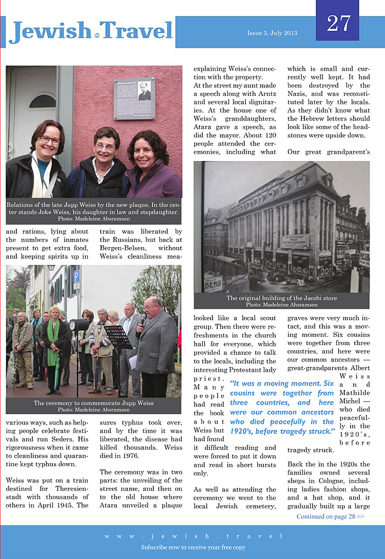 Benennung der „Jupp-Weiss-Straße“ in Flamersheim. Ein Bericht im „Jewish Travel“ Magazine (England), July 2013, S. 26-28