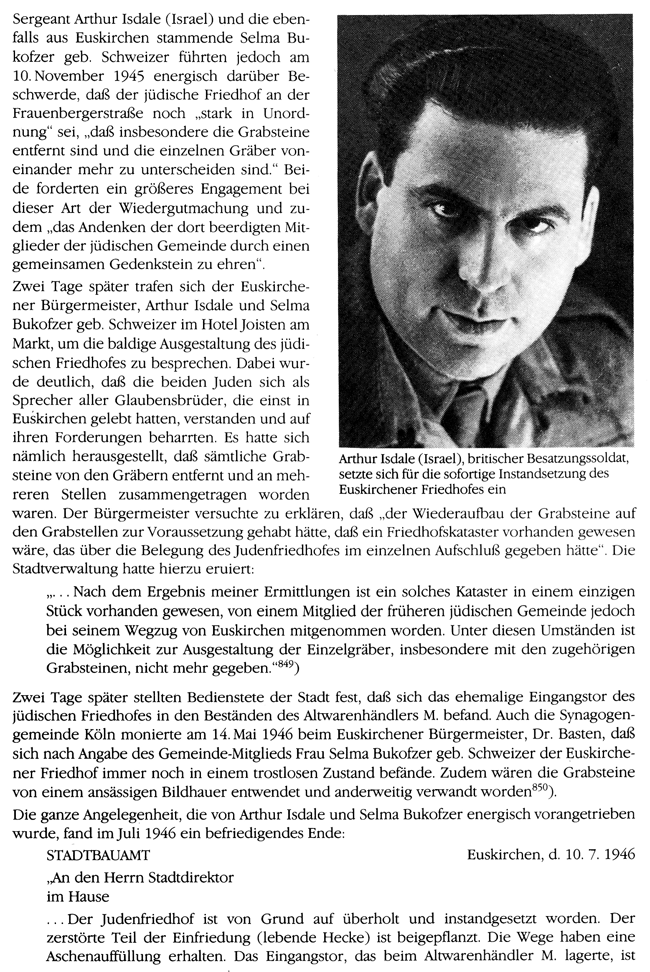 ...... Mit den Besatzungstruppen kamen auch einige Juden zurück, die im Euskirchener Kreisgebiet geboren waren. Da waren zum Beispiel Arthur Levano (1890-1960) aus Kommern, Arthur Rothschild aus Euskirchen und der aus Großbüllesheim stammende Helmut Meyer, dessen Vater Bernhard Meyer seinerzeit eine Metzgerei am Bahnhof hatte. Die Zurückkehrenden trafen beim Wiedersehen mit ehemaligen Freunden und Nachbarn eine sehr genaue Auswahl. Dennoch war ihnen alles fremd geworden. Das Aussehen der ehemaligen Heimat hatte sich geändert; viele Bekannte waren zudem im Kriege umgekommen.