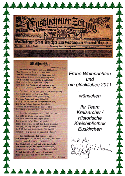 Dass darunter ein Archiv aus unserer Region mit lokalbezogener Aufmachung war, gefiel besonders. Das bewährte Team des Euskirchener Kreisarchivs sowie der Historischen Kreisbibliothek unter Leitung der engagierten Diplom-Archivarin Heike Pütz wünschte mit einem 100 Jahre alten Artikel des „Euskirchener Stadt-Anzeigers und Euskirchener General-Anzeigers“ vom 24. Dezember 1910 allen Benutzern „Frohe Weihnachten und ein glückliches 2011“: