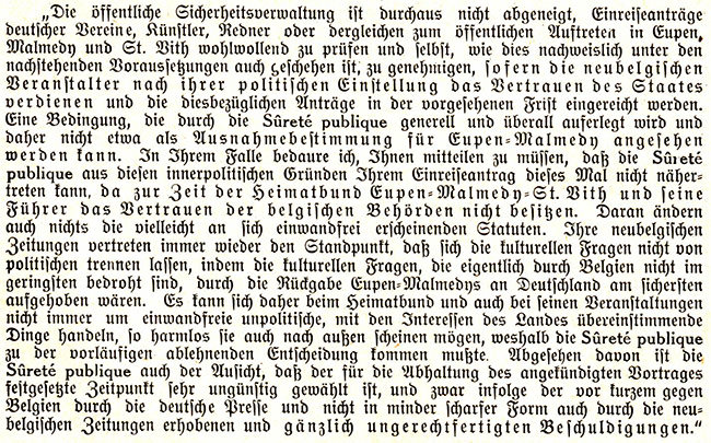 (...) Laut Versailler Vertrag fielen die deutschen Gebiete Eupen, St. Vith und Malmedy und ein Teil des Kreises Monschau an Belgien, das intensiv die Wallonisierung des zugesprochenen Gebietes betrieb und das „Deutschtum“ unterdrückte. Daher gab es in dem vom Deutschen Reich losgelösten Gebieten eine revisionistische Bewegung, die die Wiedereingliederung des Gebietes an Deutschland zum Ziel hatte (...).