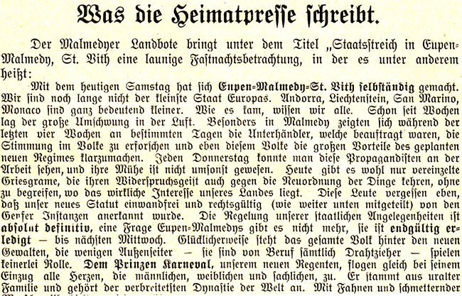 In der mir vorliegenden Ausgabe Nr. 3 von „Echo – aus Eupen-Malmedy-Monschau“, im 7. Jahrgang herausgegeben von den „Vereinigten Landsmannschaften Eupen-Melmady-Monschau“,wurde kurz nach der nationalsozialistischen „Machtergreifung“ über den Karneval im „von Belgien besetzten Land“ berichtet. Genauer gesagt geht es um die Wiedergabe des Artikels „Staatsstreich in Eupen-Malmedy, St. Vith“, der kurz vorher in der deutschsprachigen, belgischen Zeitung „Malmedyer Landbote“ erschienen war. Angeblich handelt es sich um eine „launige Fastnachtsbetrachtung“ der „Heimatpresse“(...).