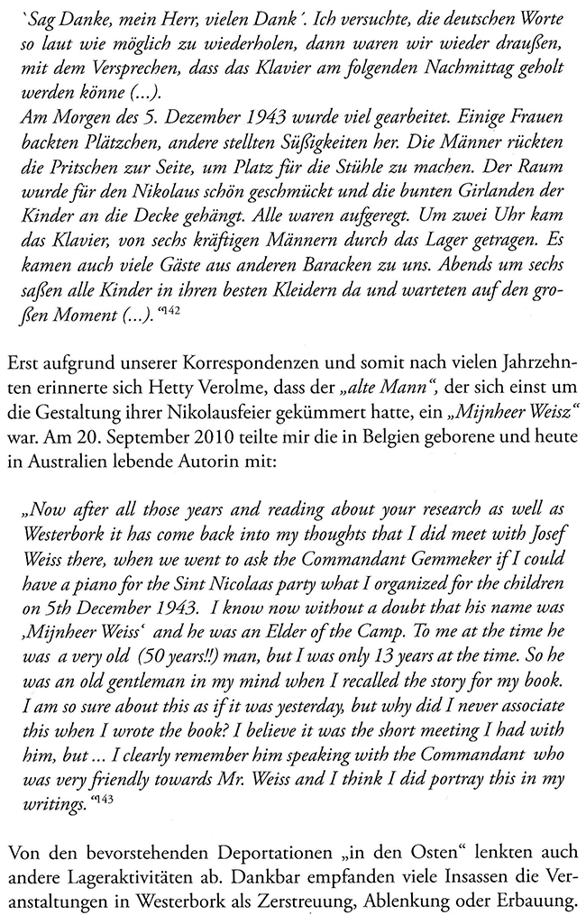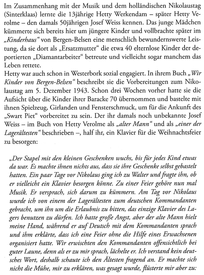 Um den Bezug zu meiner regionalhistorischen Homepage zu wahren, sei noch einmal darauf hingewiesen, dass der erwähnte „Judenälteste“ Josef Weiss (1893-1976) hieß und aus Flamersheim stammte, heute ein Vorort der Kreisstadt Euskirchen. Er und die Holocaust-Überlebende und Schriftstellerin Hetty Verolme sind die Protagonisten meiner Darstellung: „Nikolausfeier“ (Sinterklaas) 1942 im Konzentrationslager Westerbork (Niederlande)“.