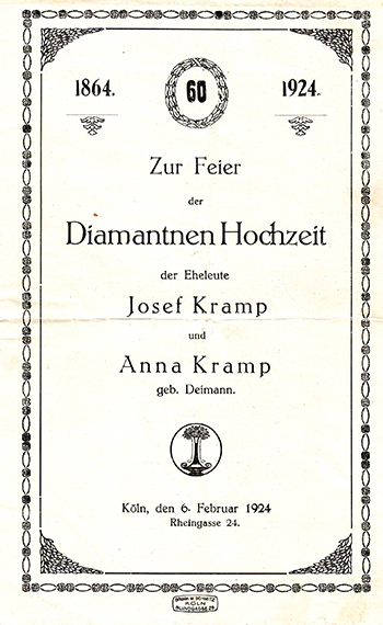 Diamantene Hochzeit von Joseph und Anna-Maria Josefine Kramp am 06.02.1924 in Köln, Rheingasse 24