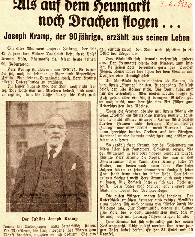 „Jupp“ schilderte 1930, anlässlich seines 90. Geburtstages, dem „Kölner Tageblatt“ seine Jugenderinnerungen. Hier ging es um Ereignisse, die vor etwa 150 Jahren alltäglich und normal waren, heute aber nicht uninteressant sind: