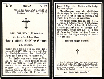 In meinem Archiv fand ich zufällig einige Unterlagen, die sich mit den Ur-Urgroßeltern meiner Frau befassen: Joseph Kramp (1840 -1932) und Anna Kramp geb. Deimann (1845 -1924). Es handelt sich um Totenzettel, Erinnerungen an eine diamantene Hochzeit (1924) und einen Zeitungsartikel aus dem Jahre 1930.