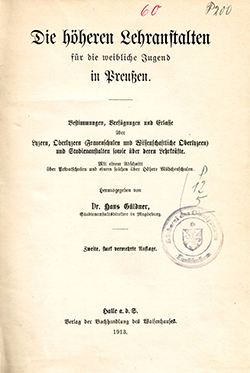 Auch für die aus der Umgebung von Euskirchen stammenden jüdischen Mädchen galten Bestimmungen, die in dem umfangreichen Band „Bestimmungen, Verfügungen und Erlasse über Lyzeen, Oberlyzeen (Frauenschulen und Wissenschaftlichen Oberlyzeen) und Studienanstalten sowie über deren Lehrkräfte“ seit 1908 bzw. 1913 festgehalten wurden. Auf knapp 1.000 Seiten richteten sie sich an „Die höheren Lehranstalten für die weibliche Jugend in Preußen“ und beinhalteten auch die „Privatschulen sowie Höhere Mädchenschulen“.